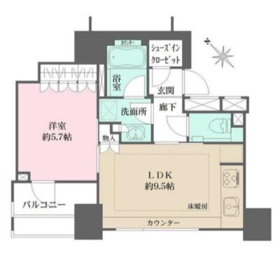 都市ガス、エアコン、CATV、バルコニー、フローリング、光ファイバー、床暖房、耐震構造、インターネット使用料無料、クローゼット、シューズインクローゼット、二人入居可、保証人不要、分譲賃貸